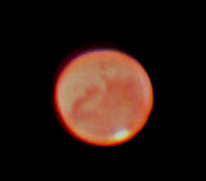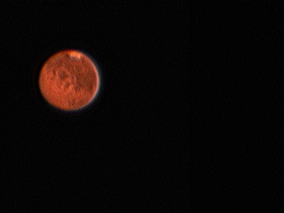 Another attempt at Mars. Unfortunately, the seeing was terrible and the sky was clouding over. And I was having trouble with the settings on the webcam (was Mars too bright?) Anyway, I got this fairly nice image despite the odds.