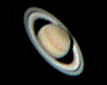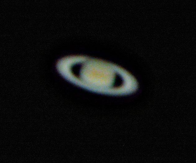 I did a fairly careful alignment of the Celestron to Polaris this time, and used mirror lockup and a remote shutter on the Canon EOS 20D to minimize vibration. Unfortunately the clouds came in quite quickly and the air was probably already thick with moisture by the time I even started. The image of the Orion Nebula consists of approximately 6 frames of approximately 10 seconds each, with ISO 1600, aligned & stacked in Keith's Image Stacker. Levels adjusted and a bit of sharpening added. I still have quite a bit of experimenting to do, and it would be nice to have a clear, dark night when I have energy and time to try again. I'm surprised Saturn came out at all. By the time I took the last frame, it was shining through the clouds. It's pretty obviously overprocessed, but hey! it looks like Saturn.