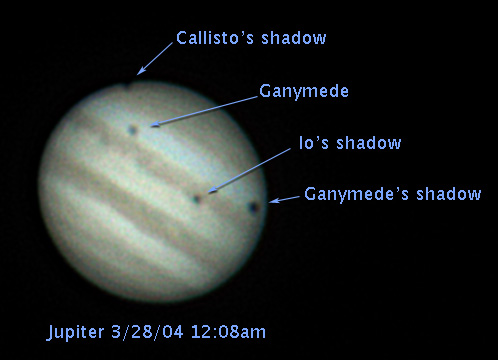 At 9pm I went to Spaceweather and they mentioned that there would be three simultaneous shadows on Jupiter at midnight - an event that only comes around about once every five years. Well, I'd never seen a shadow on Jupiter, so it sounded like the perfect opportunity. I captured all three shadows and Ganymede! Io is over the disk to the left of Io's shadow, but I can't make it out in the image.