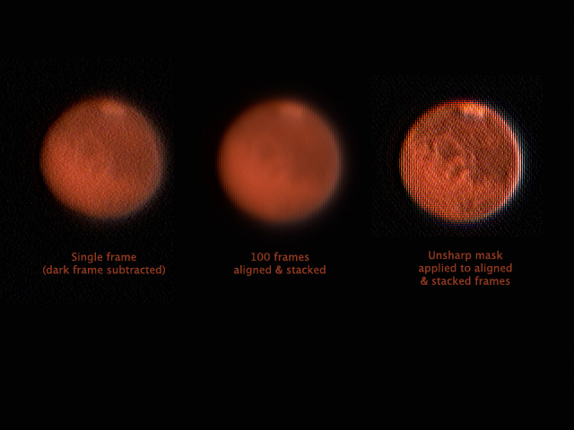 I went back and reviewed the data I had captured. Three of the movies were taken in quick succession, so I was able to combine 150 frames to produce a noticeably better Mars image.
