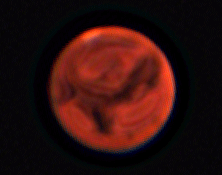 Well, this is just about as close as it's gonna get. I caught a bit of the dust storm, as compared with other astronomers. And is that arc along the right-hand side an artifact of the optics, or atmospheric on Mars? Looking at this Sky & Telescope image, I'm thinking it might be in Mars' atmosphere, but it could easily be a result of the sharpening, or stacking, or reflections in the optics.