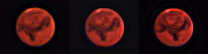 Each image is about 15-30 minutes apart. Each frame is 100+ individual frames stacked. There's a hint of the dust storm in the upper right. And the South polar cap is showing up at least a little.