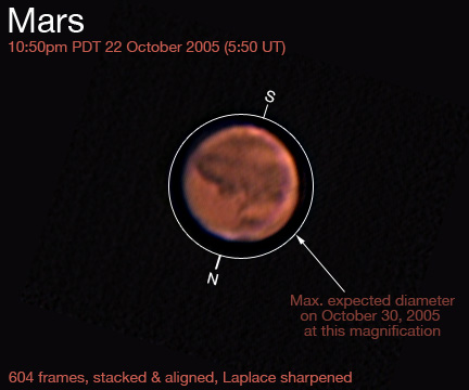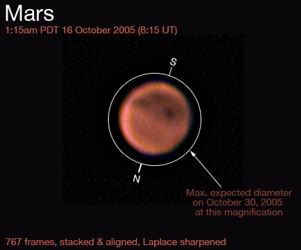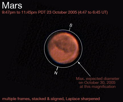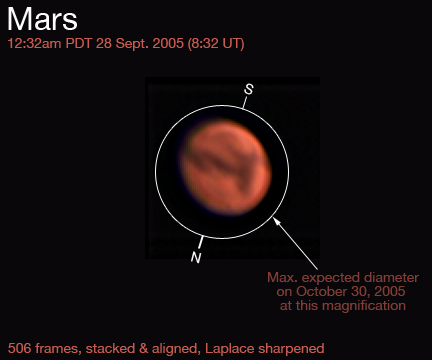 South is up (about 2 o'clock), which makes it upside-down compared to the 2003 photos below. However, this better matches the orientation at A.L.P.O, such as http://www.lpl.arizona.edu/%7erhill/alpo/marstuff/alert/mars050917c.jpg , so I think I'll adjust them all like this this time around. I used my Unibrain firewire webcam for this picture. That circular patch is the Hellas basin center top, with Syrtis Major below it.