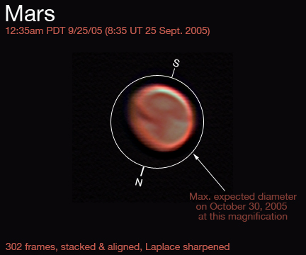 Mars, 12:32am 9/28/05 304 frames aligned, stacked & Laplace sharpened