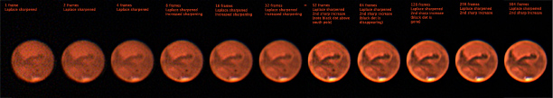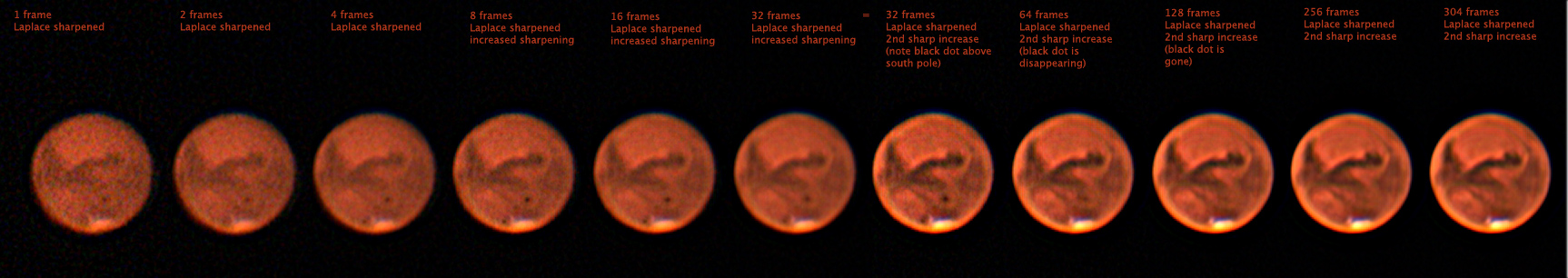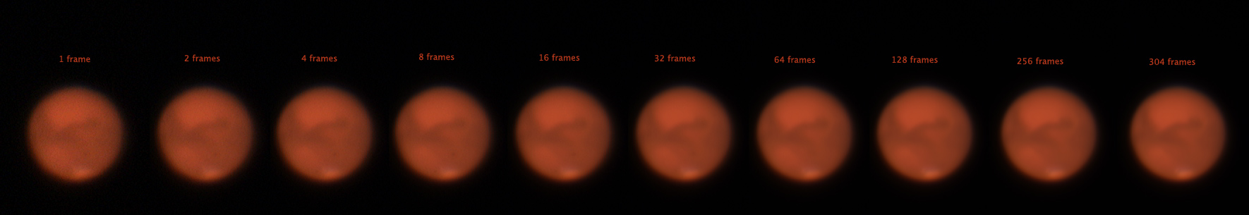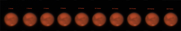 After sharpening, the improvement with each doubling of the frames is quite evident. Note that I have the 32 frames version twice, as I tweaked the sharpening there and wanted to show the transition. It's especially interesting to me that the obvious spot above the south pole disappears after stacking 64 or more frames.