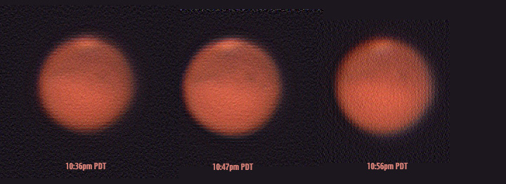 Three images each from many frames stacked & laplace sharpened (the last was a combination of 859 frames), taken at 11:02pm, 11:27pm and 12:12am PDT the night of September 12-13, 2003. If you can cross your eyes to get the images to merge, you can see a slightly three-d image of Mars. Or, click to see them combined into an animated GIF.