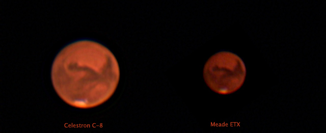 I finally got a chance to directly compare my two main telescopes. I had been getting some disappointing pictures out of the Celestron, so I wanted to see if it was the scope, or just bad seeing on those particular nights. I played with the Celestron a bit and adjusted the collimation slightly. That seemed to help. Then I took both out and within about 3 minutes of each other, took several movies of Mars from which the two pictures below were generated. My conclusion: both are great scopes and I love them dearly. The Celestron can really pull in the light (I had to lower the brightness on the webcam and it's still brighter than the ETX). But the surprise was how great the ETX is. Since it is much smaller and more portable, it gets a lot more use. I'm pleased that such great quality can come from such a small telescope.
