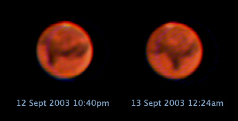 I also experimented with the 2.5x Barlow. It was much harder to keep Mars in view, but I got some nice additional detail. I played some with the Fire-i webcam's settings in Image DV and discovered that setting the sharpness higher on the webcam is useful. The image below was made from 100 frames. I subtracted a dark frame (made from stacking about 50 frames with the lens cap on) and stacked them in Keith's Image Stacker. Then I applied an unsharp mask to draw out detail. I do essentially the same thing on all images (although I don't always do a dark frame subtraction). Oh, and in Photoshop I shrunk this image down, because I thought the full-sized one didn't look quite as good. South is up, at about 2 O'clock.