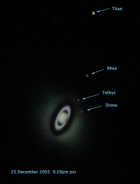 Saturn image is a composite of 25 photos aligned, stacked & sharpened in Keith's Image Stacker. Moons are a composite of 3 frames 10 or 15 seconds each. Composited in Photoshop 7.0.