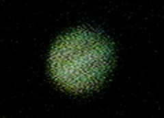 Well, the Webcam isn't all that great for Saturn. Here I have 100 frames carefully aligned, 2x resampled (to make them bigger and easier to align) and then stacked & laplace sharpened in Keith's Image Stacker. Can't even see the Cassini Division. Well, it was good to do the comparison. Taken 10:16pm PST. It's possible I was somewhat out of focus, but I don't really think that was it. The seeing was about as good tonight as it was last night. Part of the problem may be that the Webcam isn't nearly as light sensitive as the Canon PowerShot G3, and that you can't set the shutter for long exposures.