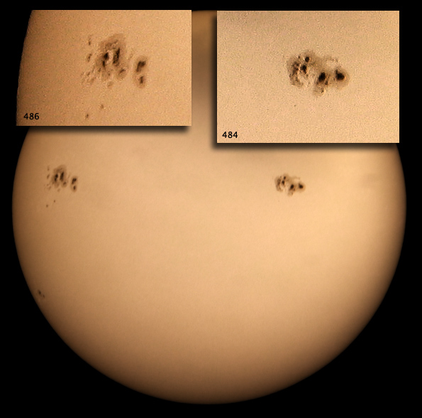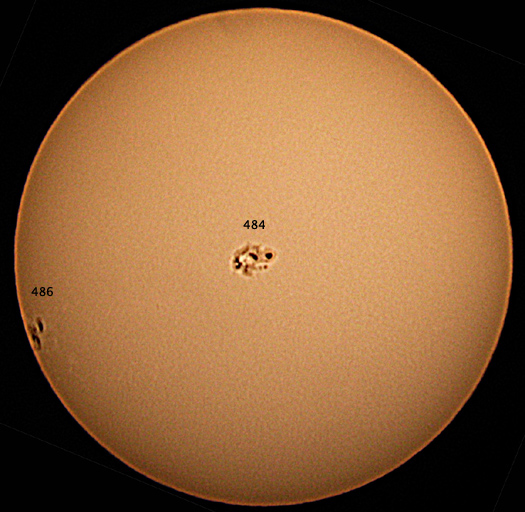 Sunspot 484 is huge, and it looks like 486 is going to be just as big. There was an X5 class solar flare, but alas I see no aurorae from brightly lit Silicon Valley. Still, the sunspot is amazing. 4 frames taken with a Canon PowerShot G3, then stacked with Keith's Image Stacker and laplace sharpened. Then I flipped it and rotated it in Adobe Photoshop so it would match the orientation of the image at Spaceweather.com. Click for the full-sized image.