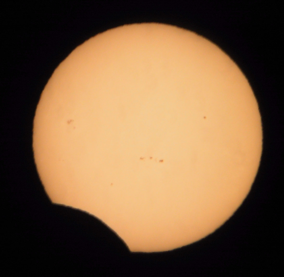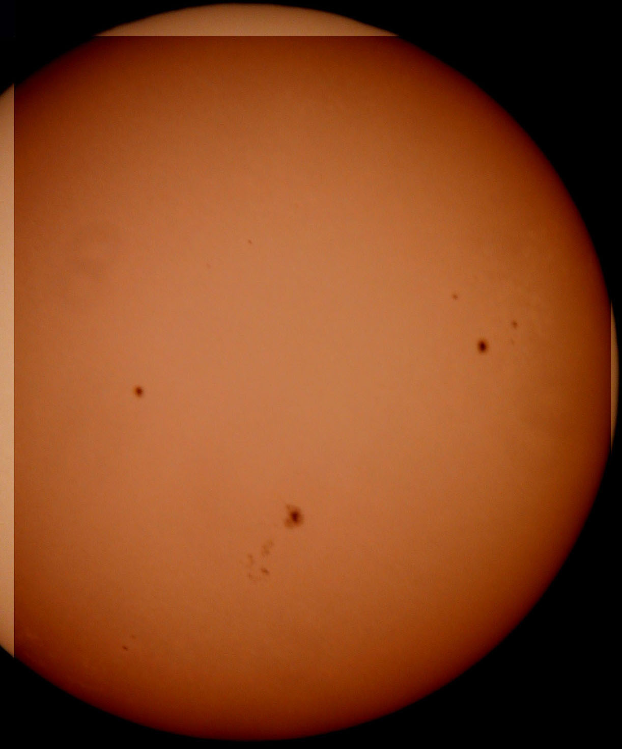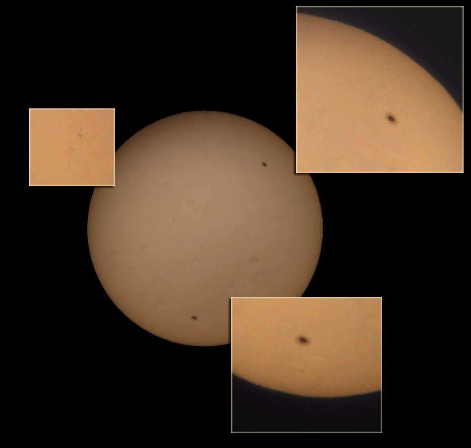 Both giant spots are easily visible without a telescope (with just a solar filter). Here are some closeups. I was getting some darkening on the Sun because I set the f-stop too small(?) on the camera, but I was able to obscure most of the problem with the closeups :-).