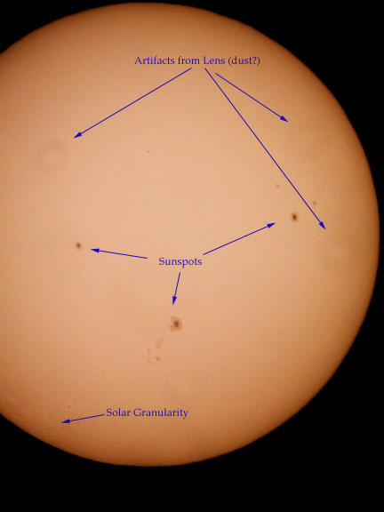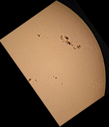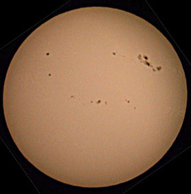 site. This image was taken with a Canon PowerShot S10. I enhanced it in PhotoShop LE using the Unsharp Mask, then turning down the brightness and turning up the contrast. Then I flipped it and rotated it so it matched the other images I found on the web. My solar filter is from Orion, and it works great! I took the picture in the late afternoon - not the best time for solar observation. I used a ScopeTronix digital camera adapter to hold the PowerShot over a Meade 26mm Plossl eyepiece. I used the timer feature on the PowerShot so that the mount would steady by the time the picture was taken. I focussed by looking at the picture in the LCD on the back of the camera. It's really just a process of experimenting and seeing what happens. |