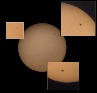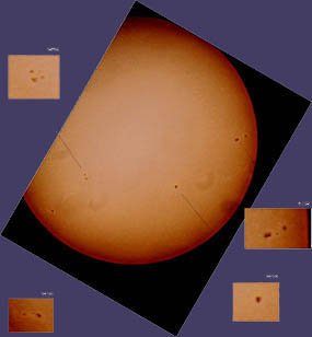 The above pictures are three separate attempts at capturing the transit of Mercury across the Sun on November 15, 1999. They were taken through my Meade ETX with an Orion solar filter, 26MM Televue Plossl and a Hi8 Videocamera. I now have my ETX mounted on an Orion SkyView Deluxe equatorial mount with a clock drive. This leads to much better vieweing at high magnifications than I was getting with a straight tripod. Video capture was done on a PC with ZipShot parallel capture device, then moved over to my Macintosh for processing. I took three successive captures and combined them in Adobe PhotoDeluxe (a wimpy version of Photoshop) using layers and the "overlay" feature. I eyeballed the correct placement of each of the three layers (actually, the first of these is four layers) turning visibility of the layer on and off until they fit as closely as I could make them.