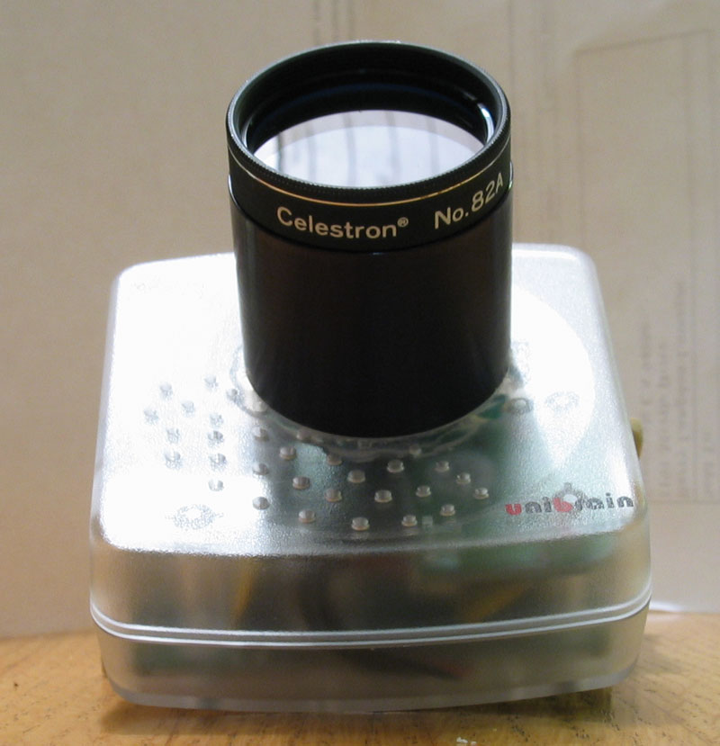 After I added the extender, I could then put a filter on it to protect the CCD from dust. Dust on the CCD is quite visible in images (I have successfully used a canister of compressed air to un-dust it). And even better, I can now put any eyepiece filter I want on the camera!