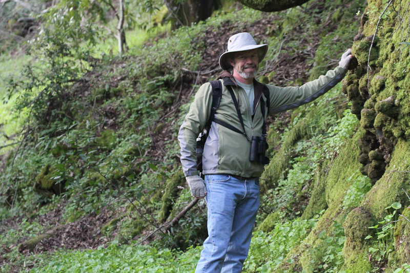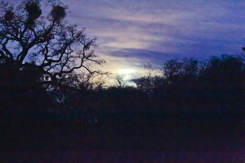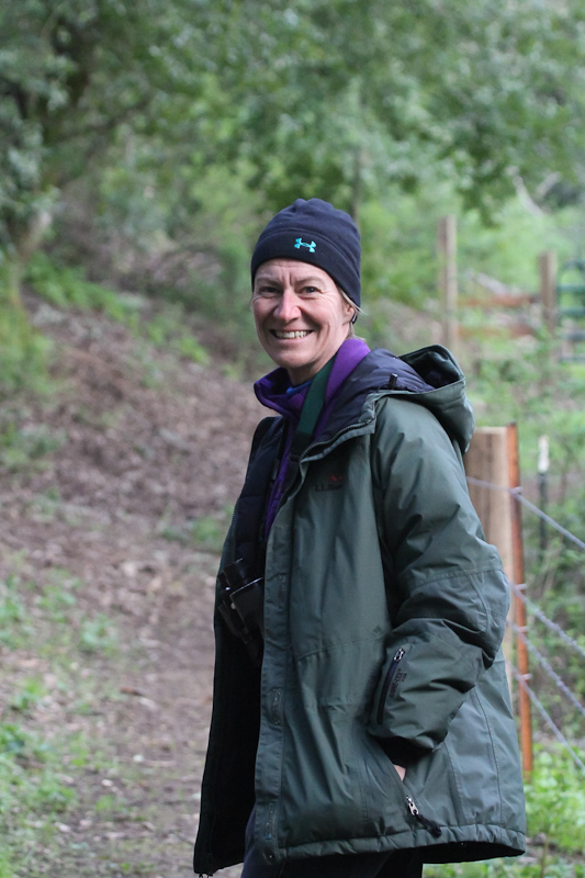 Last year we had intended to start all the way up at Smith Creek, but our relatively late start that year lead us to start less far up the mountain. This year we were early enough, arriving well before the full moon set and the east brightened with the first morning rays. Forest birds are most active in the morning, and as they wake up they begin singing. This dawn chorus is one of the most amazing things to witness, and a birder with a good ear can often pick out species calling that they won't get a chance to see in an entire day's birding. We however, are birders with fair-to-middling ears, so as the songs progressed from single melodies to overwhelming cacophany we identified only one bird that would elude us the rest of the day: Orange-crowned Warbler. We heard in the breaking dawn: Western Bluebirds, Western Scrub-Jays, Spotted Towhees, American Robins, Steller's Jays, California Towhees, more Wild Turkeys and even Wood Ducks. All of these we would later see once or perhaps many times throughout the day. If we had better-tuned ears we might have picked out some warblers, a vireo, a tanager, a local sparrow or an uncommon flycatcher, but no rarities presented themselves that we could confidently identify. Still, it was wonderful to hear the sounds of the natural world waking up. Because this part of Grant Ranch lies behind a long ridge, there are no sounds of the city to disrupt this wild preserve. It felt as if we were many leagues away from the bustle of the Bay Area.
