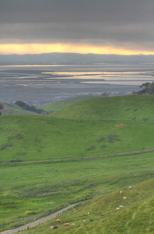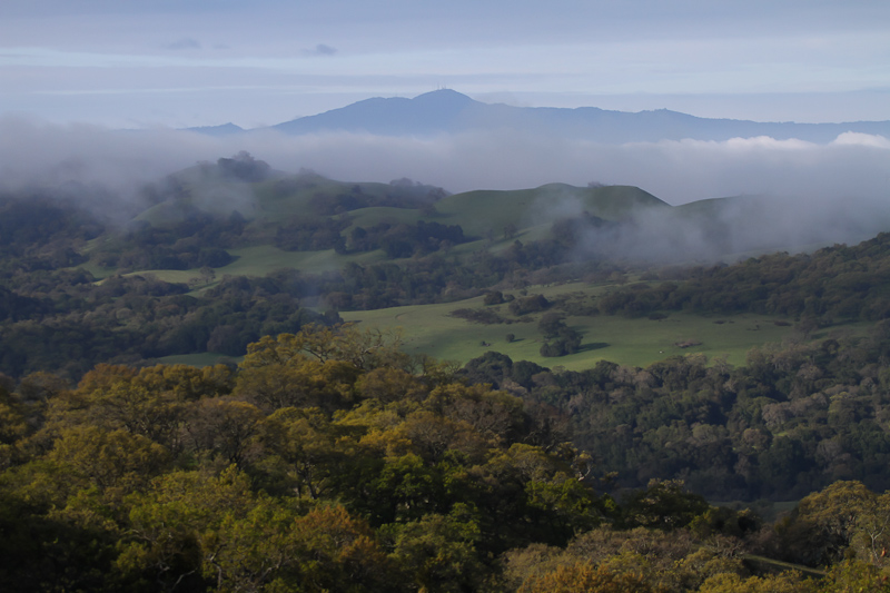 This landscape photo epitomizes to me the beauty of the Bay Area. Rolling green oak-dotted hills leading down into a fog bank (San Jose is lurking beneath that fog), with the Santa Cruz hills poking up beyond and more clouds and fog behind that. Almost worth getting up at 3:30am just to see this view.