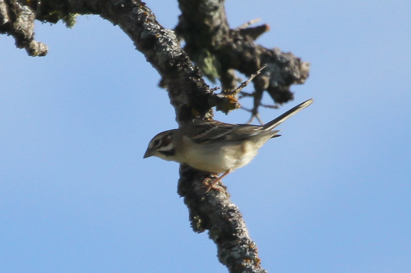 Our next birding stop was back down the mountain road, at a place called Twin Gates where there is a stand of giant oaks on an otherwise bare hill. The oaks are alive with birds: Acorn Woodpeckers, nuthatches, Bullock's Orioles, Western Bluebirds, Black-headed Grosbeaks, swallows. We found several Lark Sparrows here, which are an especially beautiful sparrow, and only found in a few places in the Bay Area.