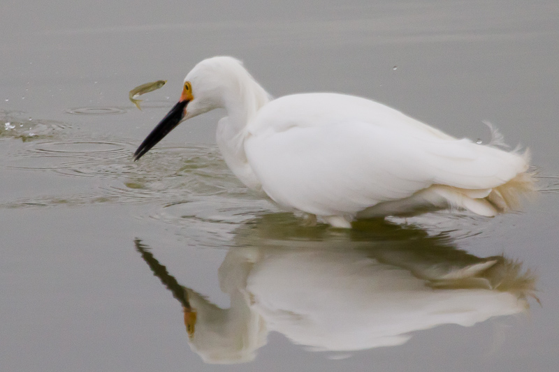 This next photo is my vote for Best Photo of the Day, and there's a bit of a story behind it. My brother pledged extra for the birdathon if I could take a photo of an egret or heron catching a fish. So, when I saw this Snowy Egret hunting, I decided to wait to see what would happen. Every minute in a Birdathon is crucial, so I was worried about time. But then the Egret lunged and came up with a fish fighting, and the egret posed so beautifully. It was a joyous moment. Unless you were the fish.