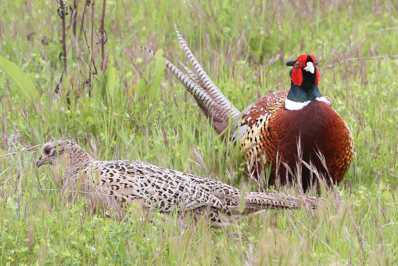 We found a pair of Ring-necked Pheasants. They aren't native to North America, but they've become well established. Male pheasants are dressed to impress this time of year. Females are dressed to hide in the grass and not get eaten along with the chicks.
