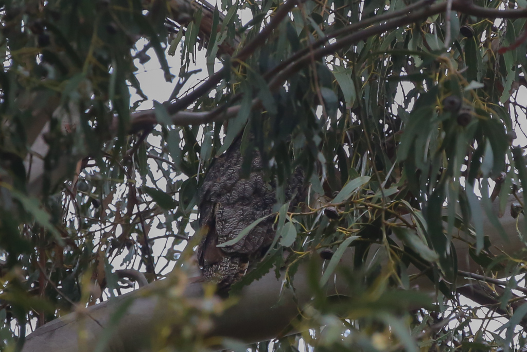 White-throated Swifts and Violet-green Swallows soared over our heads. Warblers and sparrows abounded. Hummingbirds were guarding the blooming eucalyptus trees, and then we heard the booming of a Great Horned Owl again. We spent quite a bit of time hunting for him, and finally we were rewarded with a view of his lower half well up in the eucalyptus tree.