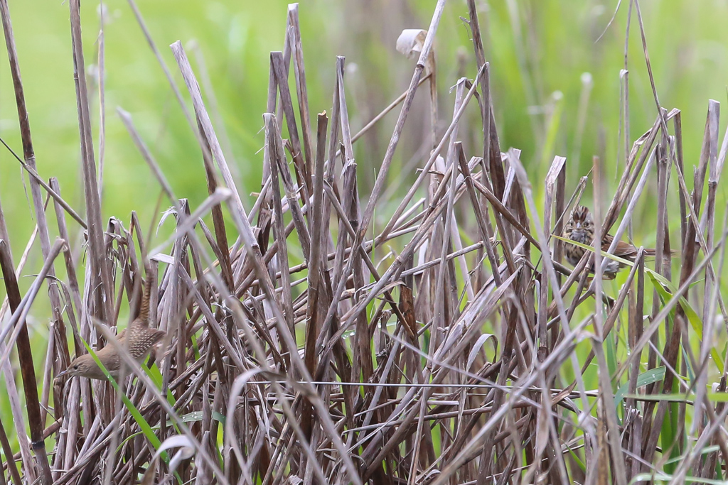 After the lake, we tracked down a calling House Wren, and when I started to take its photo, a Lincoln’s Sparrow popped up into the same batch of grass and photobombed the wren! We were delighted to get Lincoln’s Sparrow as that’s another rarity that we would not see again that day.