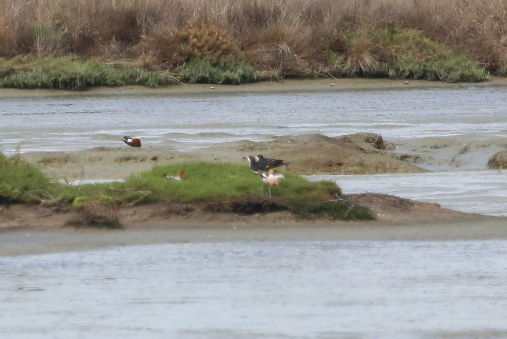 We went counter-clockwise along the bottom of the bay, stopping at Palo Alto Baylands, Charleston Slough and Sunnyvale Baylands. We saw many great birds. Some highlights were White Pelicans soaring over the bay, a distant Golden Eagle (our second of the day), Black Skimmers with their ridiculous “Kandy Korn” bills, an elusive Fox Sparrow lurking in the grass under a bush, and glimmering Anna’s Hummingbirds feeding on the planted flowers near the ranger house.