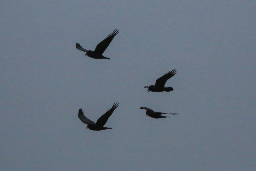 Our last stop in the hills was Sierra Road. This is a favorite spot not just for the grassland species that are rare elsewhere, but because its position on the top of the hill makes it a place where migrant songbirds and hawks pass by and sometimes stop to rest. This is where, on my first birdathon in 2004, I found the rarest bird of the year: Lapland Longspur in full breeding plumage, a very long way from Lapland :-). Today was not a day for rarities, as the wind and the rain had whipped up again, making it a dismal spot to find any birds. We got no new species on the hilltop; almost no birds at all, just a family of four Ravens dancing across the gray skies.
