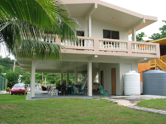 The house is two story, with the bottom floor entirely open air except a bathroom and a utility closet. The top floor has three bedrooms, one & a half baths, a living room, kitchen and wrap-around balcony ("widow's walk"). The windows are screened and have wooden slot-style shutters that can be closed during rainstorms. None of the windows have glass - this gives good air flowthrough and better safety in the event of a hurricane. The top floor is tile throughout.