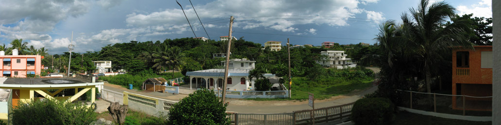 Casa Badillo in the Puntas suburb of Rincón, Puerto Rico is a private guest house with a yard sitting in the shade of coconut palms on Sandy Beach. It is located just downslope from La Cadena Hills which mark the western edge of the tropical-forest-covered Cordillera Central (central hills). Nearby habitats include a small pasture (grassland), an empty lot (grass, weeds and short shrubs), forest (acacia, mango and other trees), rural yards (short grass, cultivated plants), and of course a sand beach (coconut palms, beach vine, beach bean, other vines). Sandy beach runs east-west with the AtlanticOcean to the north. The western edge of the beach is marked by an outcrop of eroded Karstic limestone rocks, which we refer to as "Bikini Rock" (maps label the area as "Punta Gorda"), resting on sandstone. The eastern edge is loosely denoted by tidepools set in smooth sandstone lying at a slight angle on the beach.
