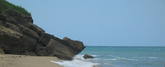 We are fortunate to have a wonderful outcropping of sedimentary rocks at both ends of Sandy Beach. "Bikini Rock" to the west has an incredible array of fossils. To the best of my knowledge, the outcropping is Karst limestone, from the Tertiary period (between 24 and 55 million years ago). By the lighthouse there are outcroppings more obviously Karst (they better match what we saw up at Arecibo Observatory and Rio Camuy Caverns in the Karst district to the northeast).