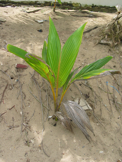Our backyard is grass with patches of sand. Red shore crabs live around the edges of the property, which is bordered by a chain-link fence set in a rim of concrete. Along the back are several coconut palms, some quite mature.