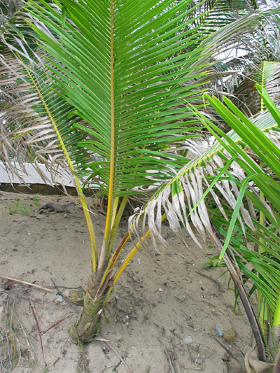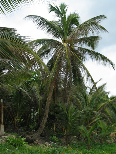 There is an amazing variety of plants in our neighborhood. Residents plant all the regular "exotic" tropical species such as hibiscus and banana. The weeds seem to be dominated by relatives of the pea family, with some wild cucumber, milkweed, and morning glory. All along the edge of the beach, for miles, the coconut palm dominates the landscape. Casa Badillo has eleven coconut trees in its small backyard, not counting the ones leaning over from the adjacent properties.