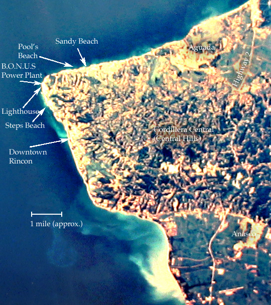 Satellite photo of the Rincón area. Casa Badillo is on Sandy Beach along the north shore (photo taken at Arecibo Observatory and annotated in Photoshop) |