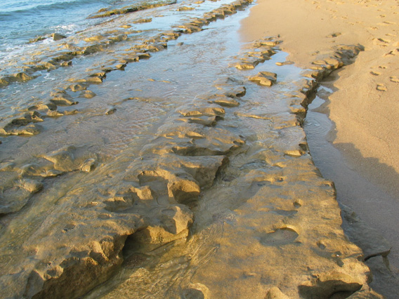 With all this sedimentary rock around, there are bound to be fossils and sure enough if you climb around 'Bikini Rock' you'll see a variety of fossilized creatures, most especially coral. The sandstone outcropping also has some fossil coral and shells. In between the beach is all sand, but offshore there are more rocks, likely the same as the rock outcropping to the west. Much of the sand of Sandy Beach is probably eroded sandstone.
